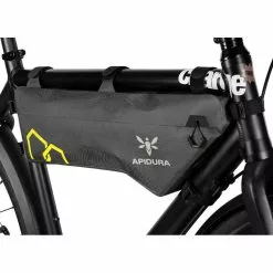 Die Tasche ist auf kompakte Rahmen zugeschnitten und aus leichtem wetterfestem Laminat geschneidert, das auch widerstandsfĂ€hig genug fĂŒr den Off-Road-Gebrauch ist. Die Tasche ist stabil genug, um auch schwerere Dinge aufzunehmen und damit den Schwerpunkt des Rades niedrig zu halten.
